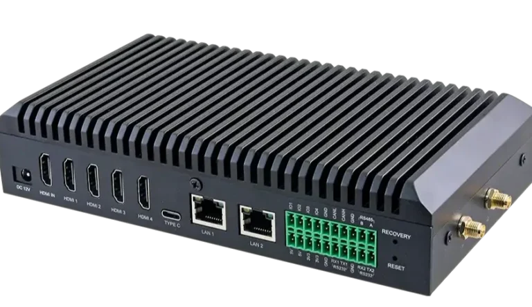 RK3588と6TOPS NPUを搭載し、外部コントローラー不要で1×3または1×4のビデオウォールを直接駆動。リアルタイムの視聴者分析が同時に可能。